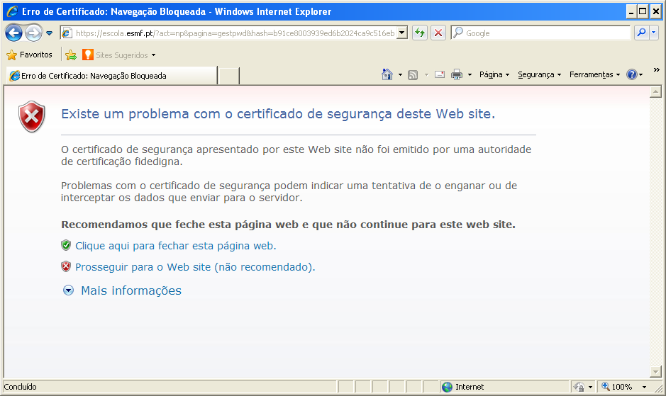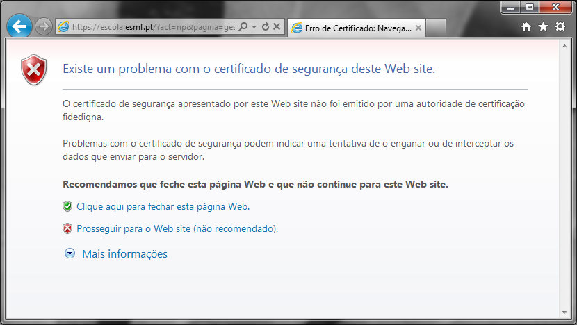 Teimo em usar o Internet Explorer e ao tentar ir à página do Webmail deparo-me com uma "mensagem de erro" do tipo ilustrado...