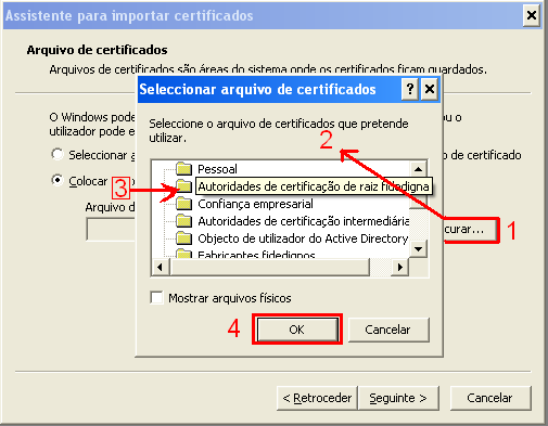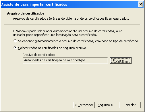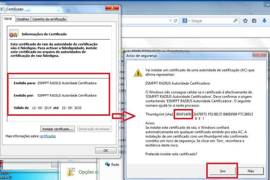 - (5) SE está a utilizar o Windows 7 ou inferior, deverá ter o ficheiro certificado comum para autenticação com o serviço RADIUS no servidor Linux. Este ficheiro RENOVADO EM 12-SET-2014 E QUE DEVERÁ SER INSTALADO (substituindo) O ANTERIOR está anexo a esta mensagem. A NOVA VERSÃO da configuração do freeradius permite a utilização de equipamentos móveis sem a necessidade de instalação do certificado raiz, no entanto por factos alheios à gestão da rede, o sistema operativo Windows necessita do certificado raiz para a autenticação.