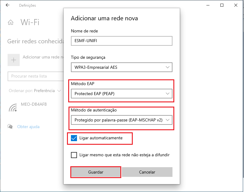 Abaixo ilustra-se, passo a passo, como adicionar manualmente a rede ESMF-UNIFI ao computador, quando este detecta mal o tipo de rede (está a ocorrer com alguma frequência, estamos a tentar resolver o problema a nível de controlador).
