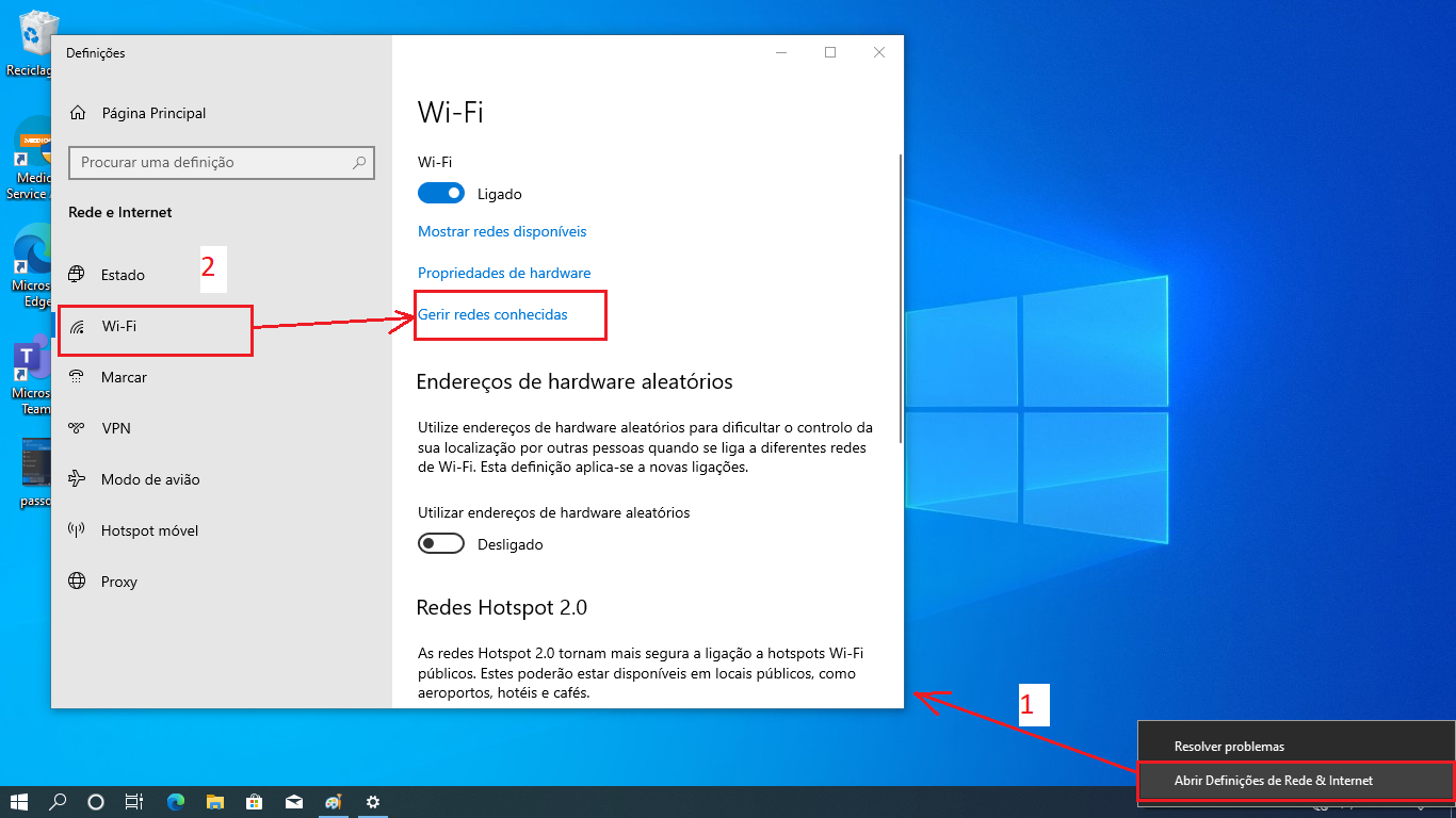 Note-se que os passos iniciais são resutantes da acção no botão "direito" do rato (ou touchpad) do computador, sobre o ícone da rede e escolhendo a opção "Definições de Rede e Internet".